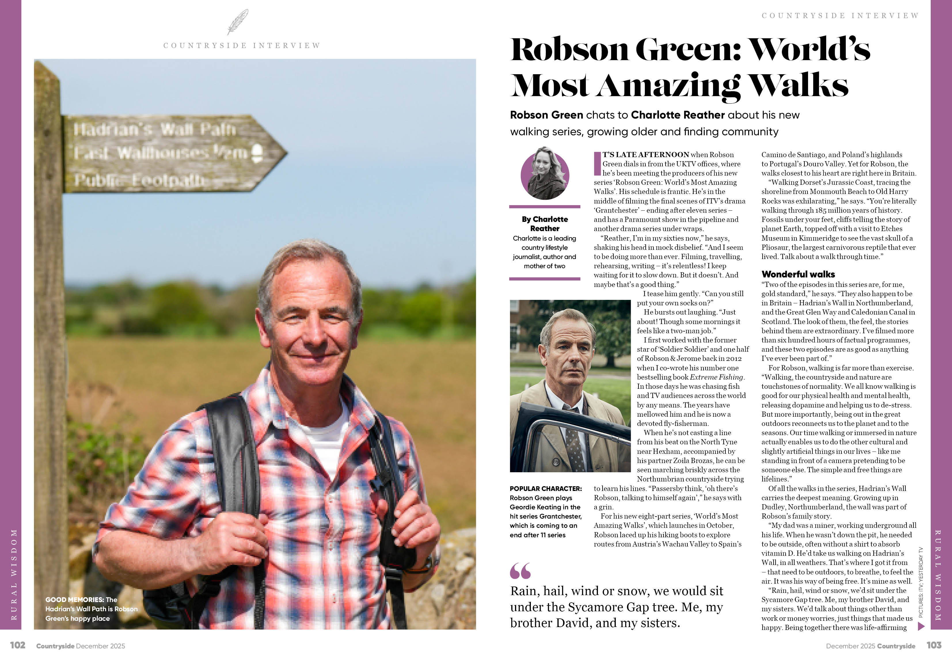 This month, we also have a rather charming interview with actor and presenter Robson Green to mark his new series, ‘World’s Most Amazing Walks’. From tearaway squaddie in ‘Soldier Soldier’ and chart-topping crooner with Robson & Jerome to something approaching a national treasure as he finishes his 11th series of ‘Grantchester’, it feels like he’s been an ever-present on our TV screens for the past three-and-a-half decades. He speaks movingly of his love for the Northumbrian landscape and how nature and walking have been a grounding force in his life.